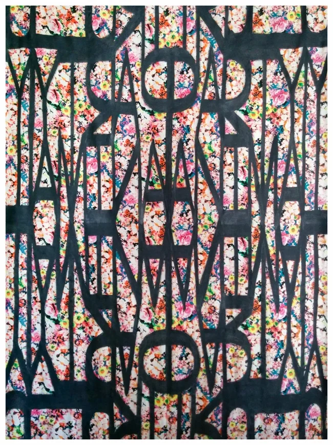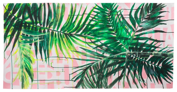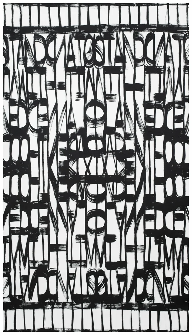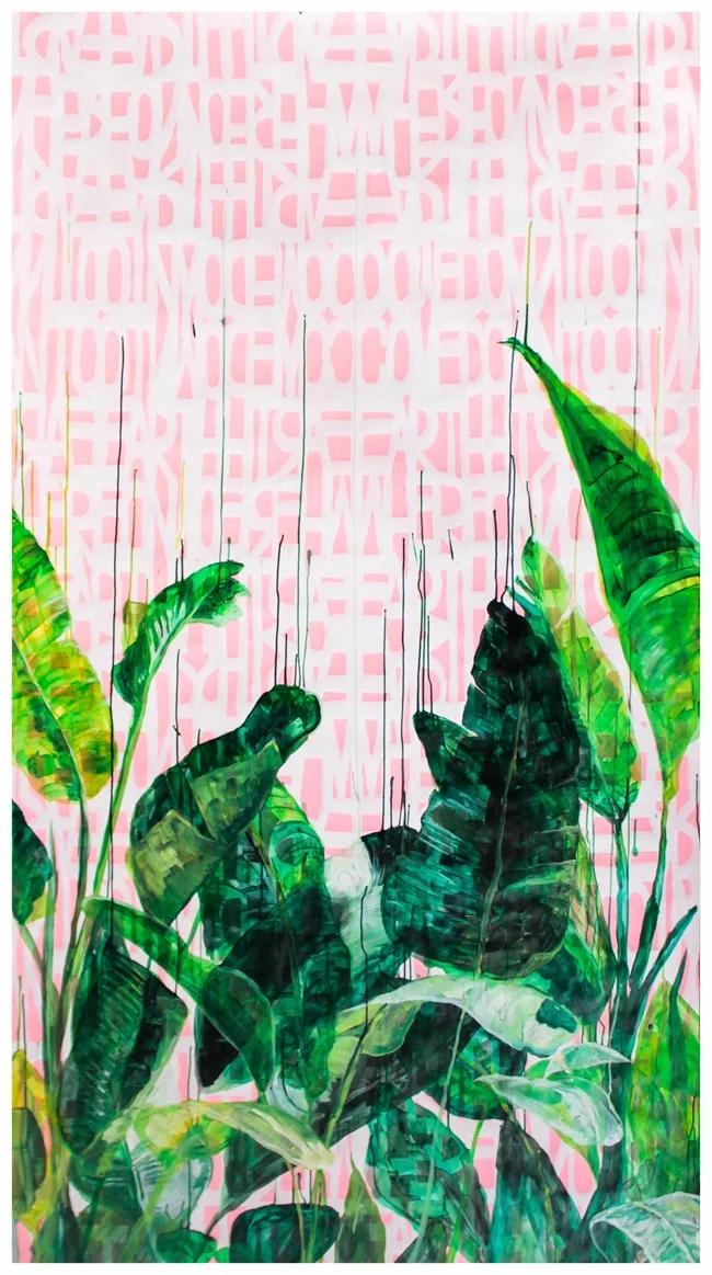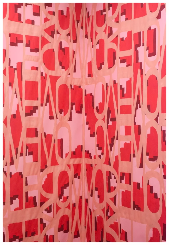 This system of working then developed into the paintings seen here. Every choice made was dictated by the original sketch including color, size, text, and composition. By using this set of rules, I hope to shed light on how we view aesthetics, and how something as recognizable as text and figures can become abstracted and redefined to create something new.